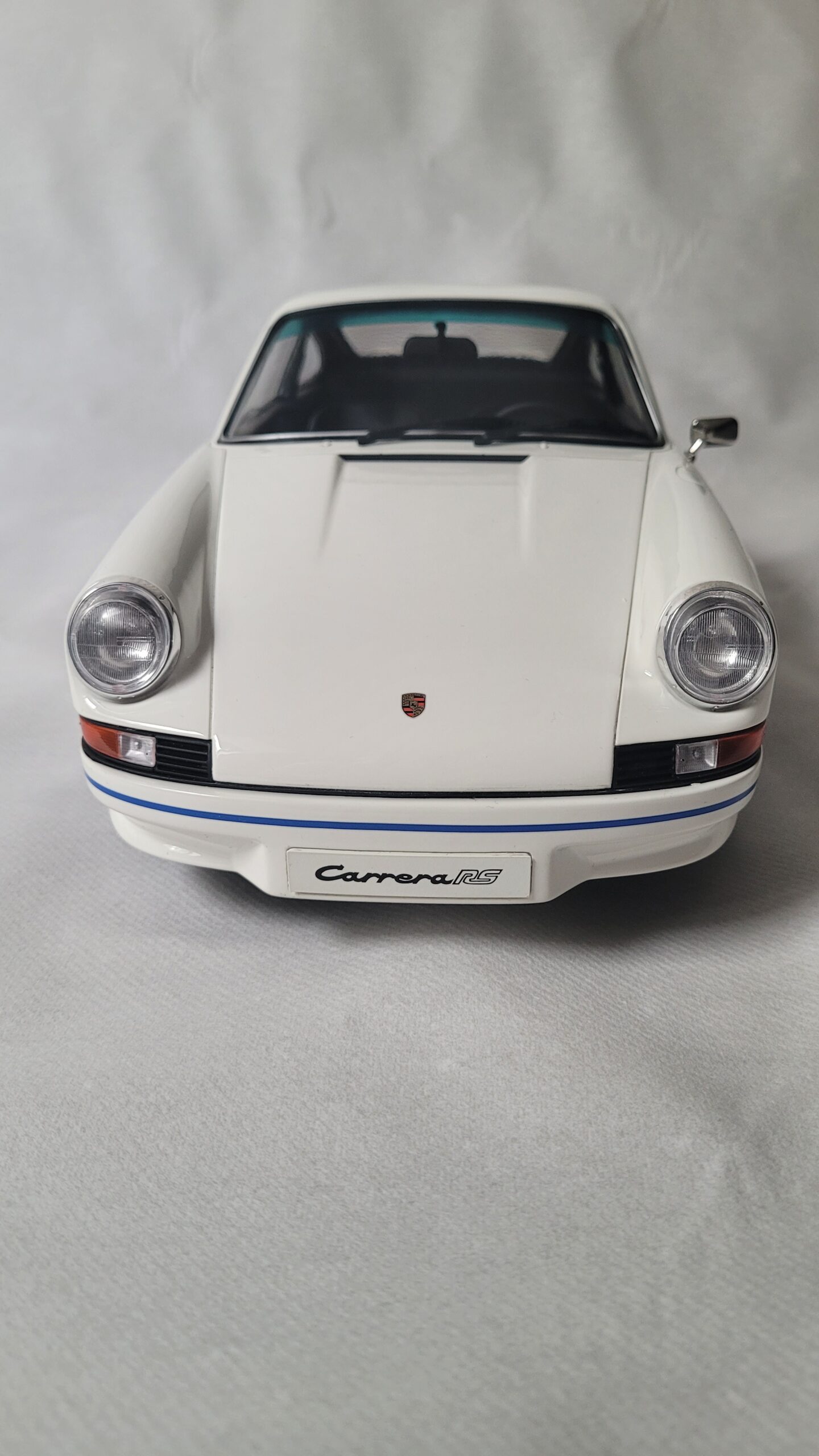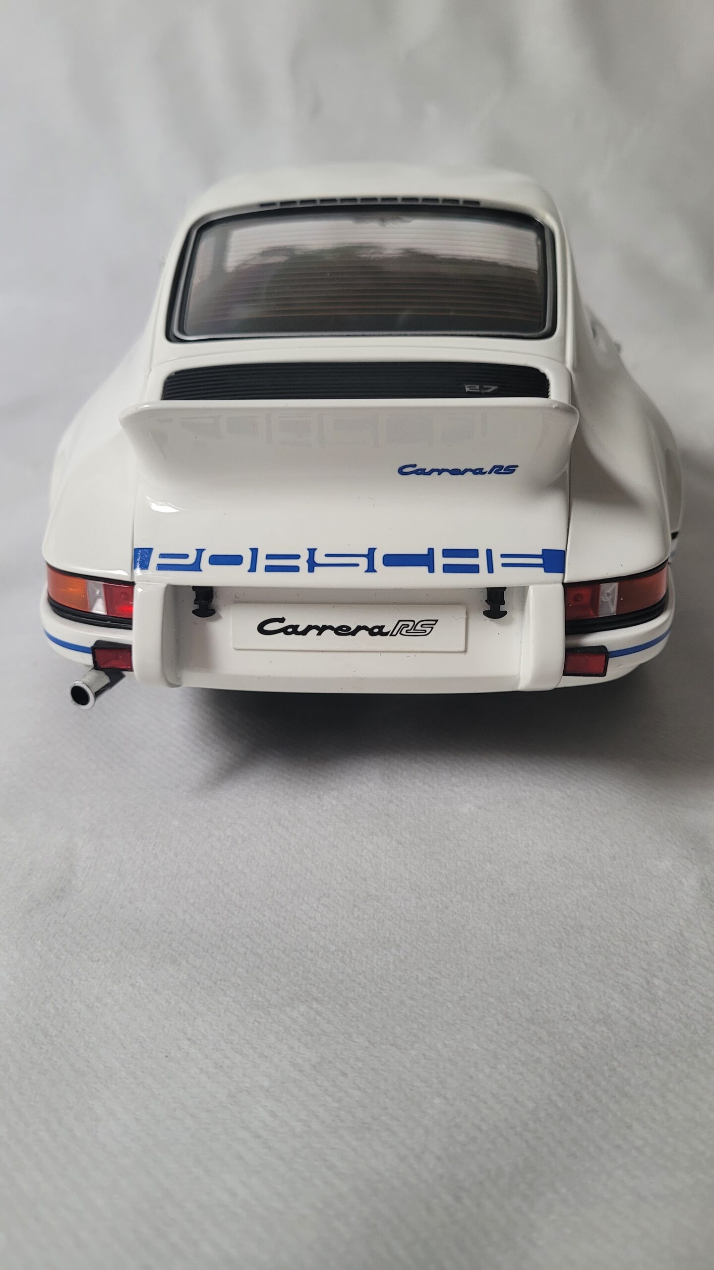 Cette voiture miniature à l'échelle 1:12 est une réplique de la Porsche 911 2.7 RS en blanc avec des bandes latérales bleues.