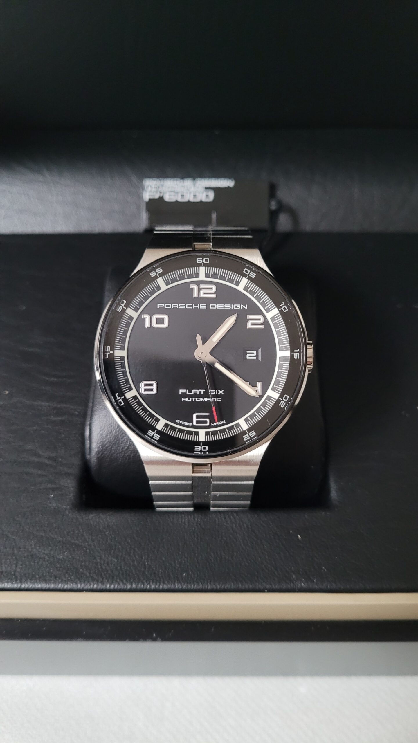 Une belle montre pour homme de Porsche Design, modèle Flat Six, numéro de référence P.635042440276. La montre est alimentée par un mouvement automatique visible au dos de la montre. Le cadran est facile à lire grâce au fond clair et aux index sportifs. Également équipé d'un affichage de la date à 3 heures. Le verre est en saphir.